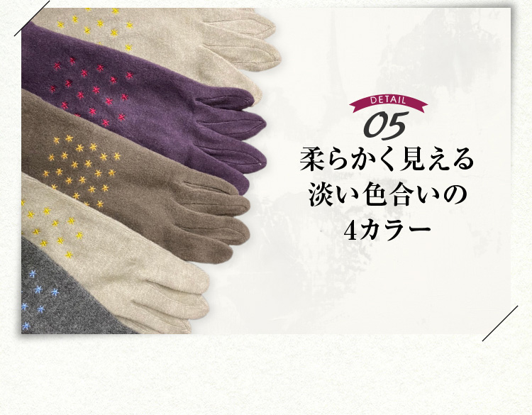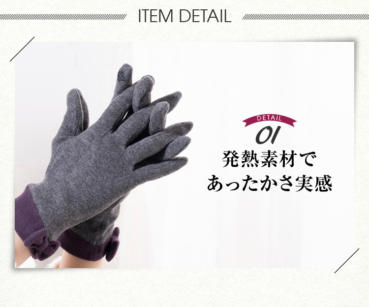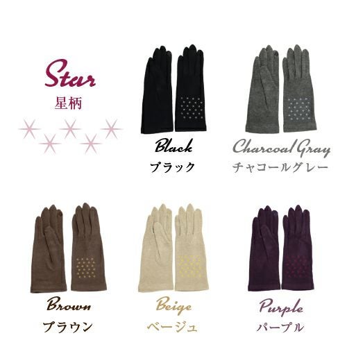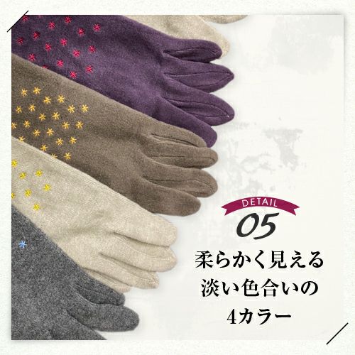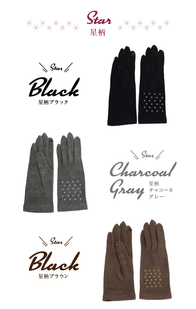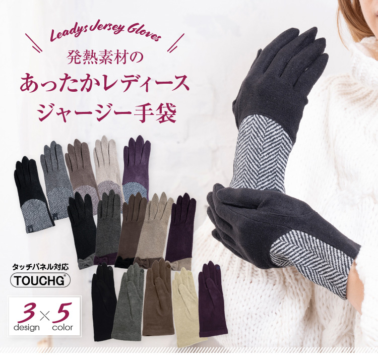 発熱特殊加工を施した発熱素材を使用しているので寒い季節も暖かさが実感できるレディースジャージ手袋。ストレッチ性にも優れ着脱のしやすさも特徴です。親指と人差し指に花柄の刺繍を施しており、詩集部分でのスマホ操作も可能なのでいちいち手袋を外す必要もありません。デザインもシャープに見える異素材シェブロン柄とフェミニン感がかわいいリボン飾り裾カラー切り替えとシンプルな星柄刺繍の3パターン、カラーも淡く感じる色合いで柔らかい風合いを演出。この季節の一押し手袋です。