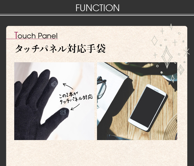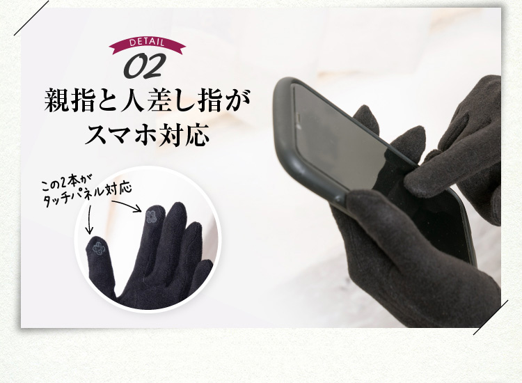 親指と人差し指にタッチパネル加工を施しているので、駅や公園のような屋外でも手袋を外さずにラクラクスマホ操作!