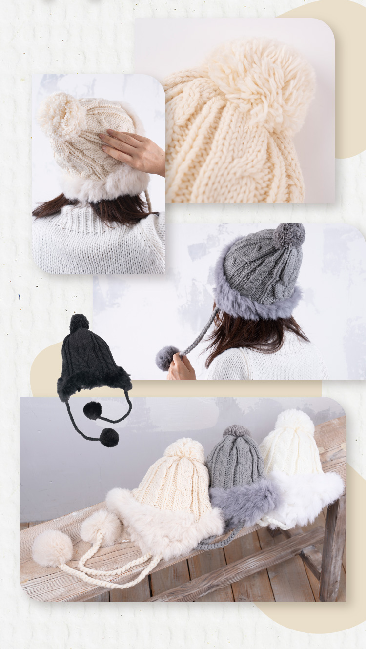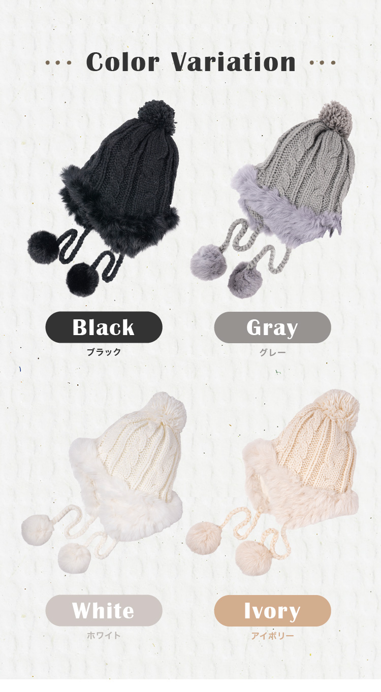淵部分のファーもかわいく耳も しっかりガードで冬も快適。 トップと紐の先には梵天付き。 紐の先の梵天はファーでかわいらしさアップ。 ファー部分はふわふわのラビットファー