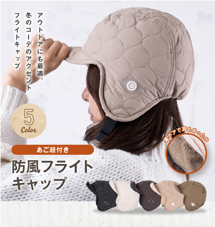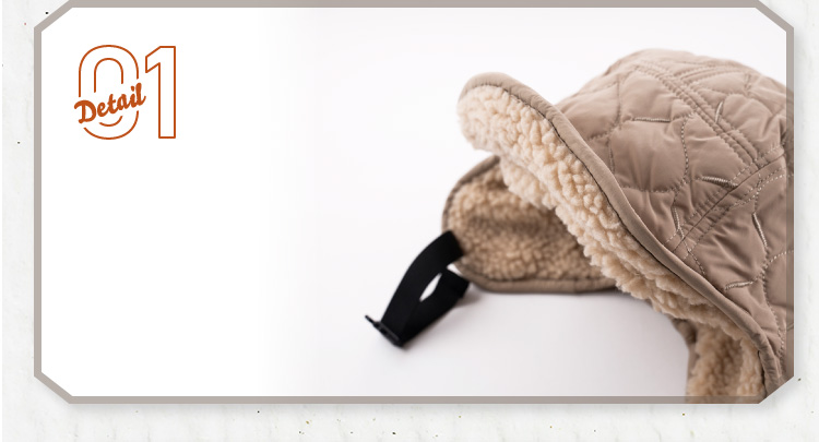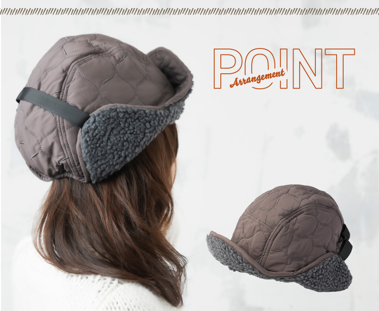 冬のコーデのアクセントイヤーフラップ付きフライトキャップです。ナイロンのキルティングで見た目はすっきりなのにシンプル過ぎないデザイン。リバーシブルにもなっているのでボア部分を表にすることも可能です。釣りなどのアウトドアにも最適。耳をやさしく守ります。耳当てを下ろしたり、耳当てを上げたりつばを上げたりといろいろなアレンジが可能。