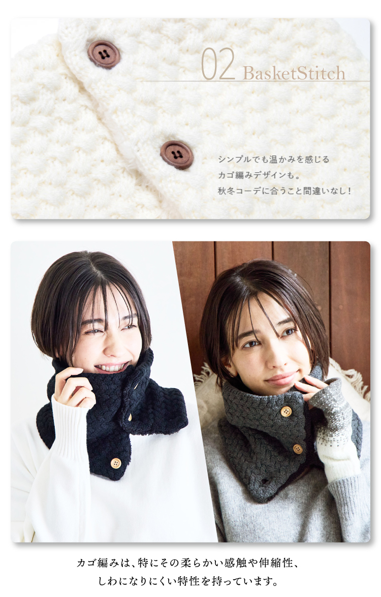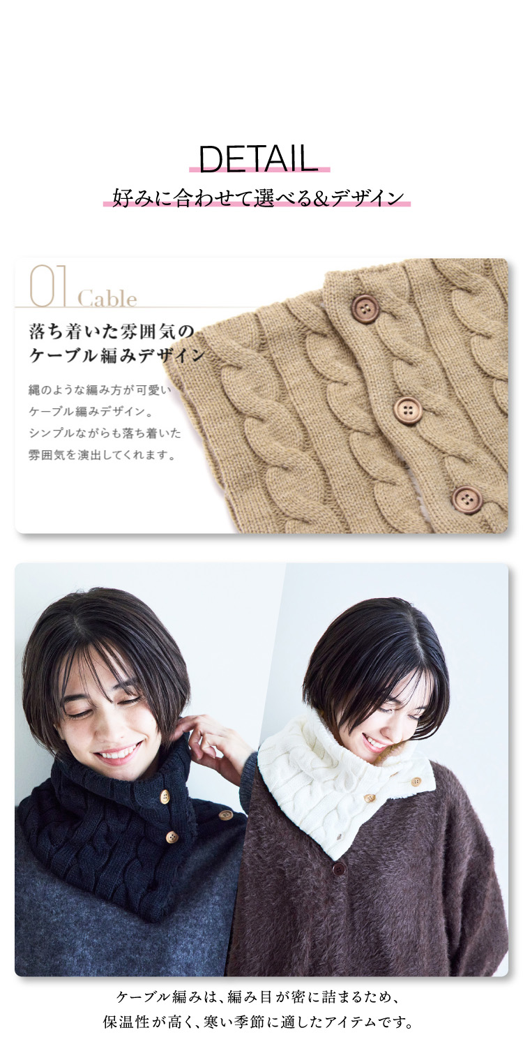 合わせやすいケーブル編みとバッファローチェック柄のハーフハーフの切り返しでシックで暖かそうなイメージのデザインです。角度によって表情も変わるのでファッションのワンポイントに。表はデザイン的にも秋冬らしいニット編み♪裏地はふわふわもこもこのボアだから、吉備元をすっぽり包み込み抜群の温かさと付け心地♪すっぽりかぶるだけなので着脱もラクラク♪屋内外の移動の出入りの際にもサッとスムーズに行えます。カラーはブラック、ホワイト、レッドの3色からお選びいただけます。