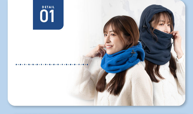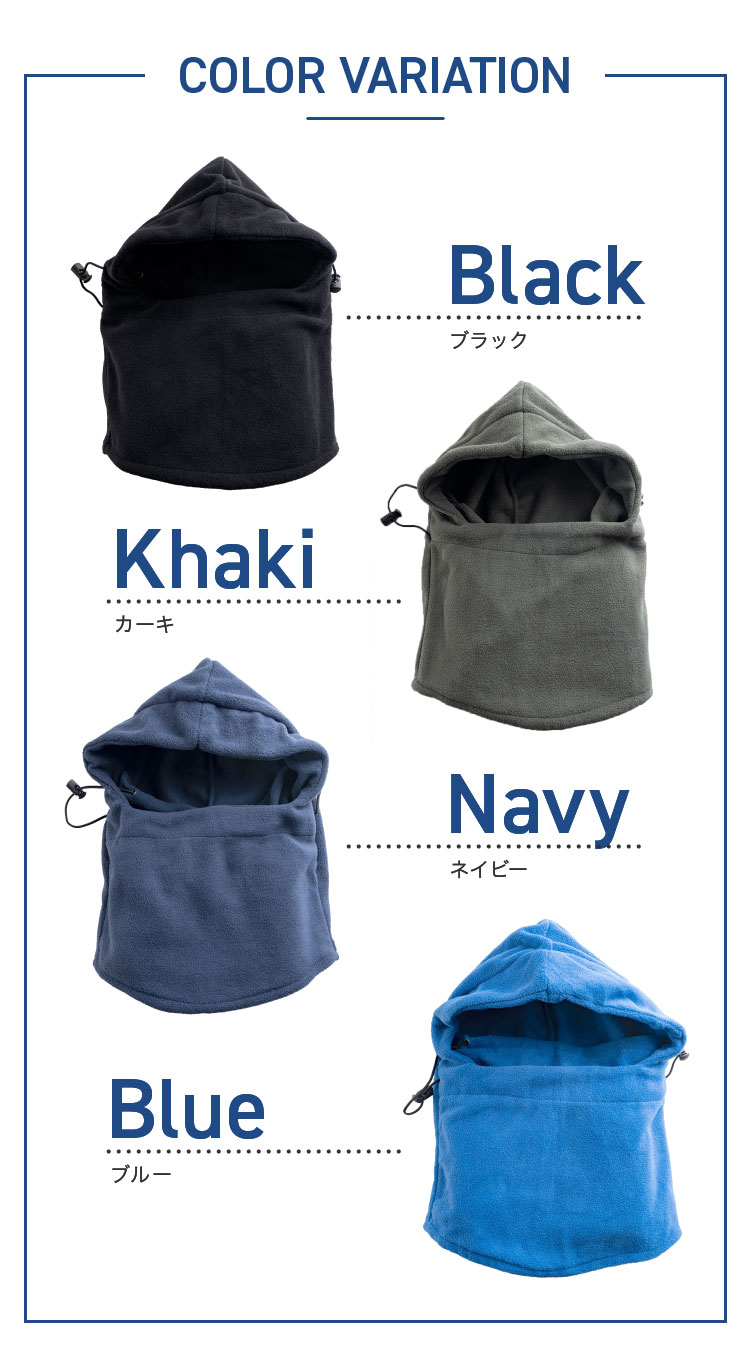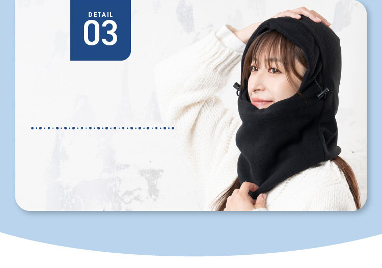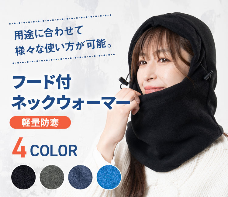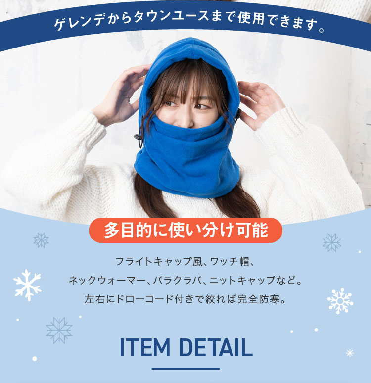 タウンユースの防寒対策からウィンタースポーツまであらゆるシーンで大活躍!フード付ネックウォーマー。軽くて暖かいフリース素材のネックウォーマーでフードを使えばネックウォーマーからバラクラバ、フライトキャップまで使い分けが可能!スノボなどのウィンタースポーツはバラクラバとして、通学など自転車に乗るときはネックウォーマーなど用途に合わせて使用できます。