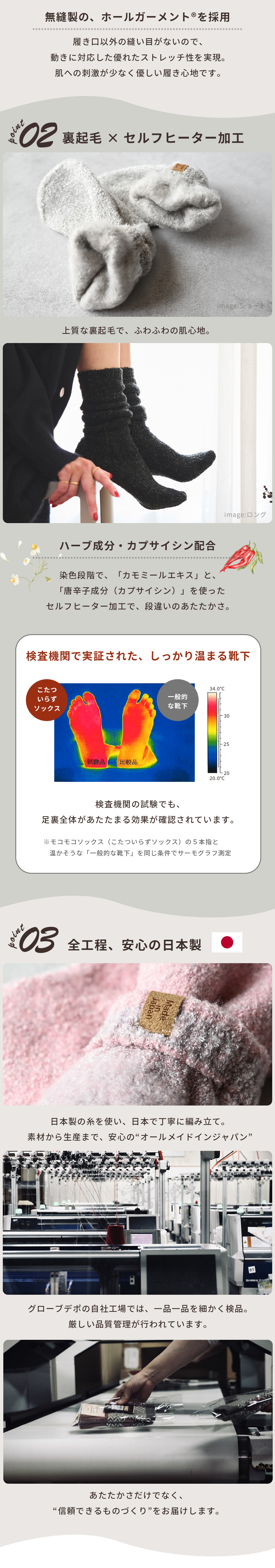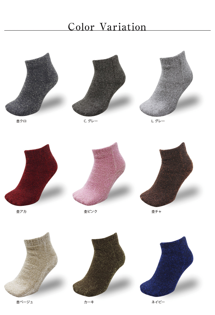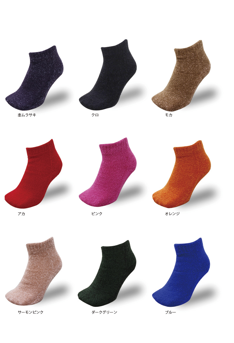 大好評のてぶくろ屋さんが作ったモコモコソックスシリーズにゆったり温める先丸ソックスシングルバージョンが登場です。のびのびフィットにふわふわモコモコの肌触り。シングルタイプでもほかの靴下では味わえない暖かさです。 柔らか素材のシュークリーム糸を使用した立体編み立てにより足にぴったりフィット!足全体をゆったり包み込みます。裏側の起毛は、現在ほとんどの企業が「金属針起毛」に移行する中、 当店ではお客様により高品質な商品をお届けしたいという思いから、 チーゼルという天然植物を使用した「チーゼル起毛」を採用。職人の手作業によるきめ細かな起毛は金属針起毛では不可能な柔らかなタッチを生み出し 抜群の肌触りを実感いただけます。更にカプサイシンとカモミール成分配合によるセルフヒーター加工を施しており、 自然の力で血流を良くする効果があるので更にポカポカ。 ショートタイプでくるぶしまでの長さでもしっかり暖かい可愛いソックスです。お部屋でのリラックスタイムやお出かけの際にもどちらでもお使いいただける必需品です。 カラーも豊富な20種類からお選びいただけます。