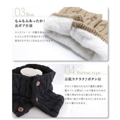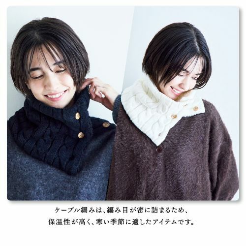 合わせやすいケーブル編みとバッファローチェック柄のハーフハーフの切り返しでシックで暖かそうなイメージのデザインです。角度によって表情も変わるのでファッションのワンポイントに。表はデザイン的にも秋冬らしいニット編み♪裏地はふわふわもこもこのボアだから、吉備元をすっぽり包み込み抜群の温かさと付け心地♪すっぽりかぶるだけなので着脱もラクラク♪屋内外の移動の出入りの際にもサッとスムーズに行えます。カラーはブラック、ホワイト、レッドの3色からお選びいただけます。