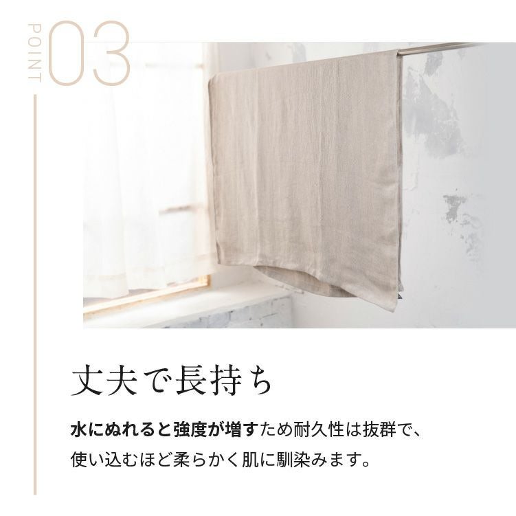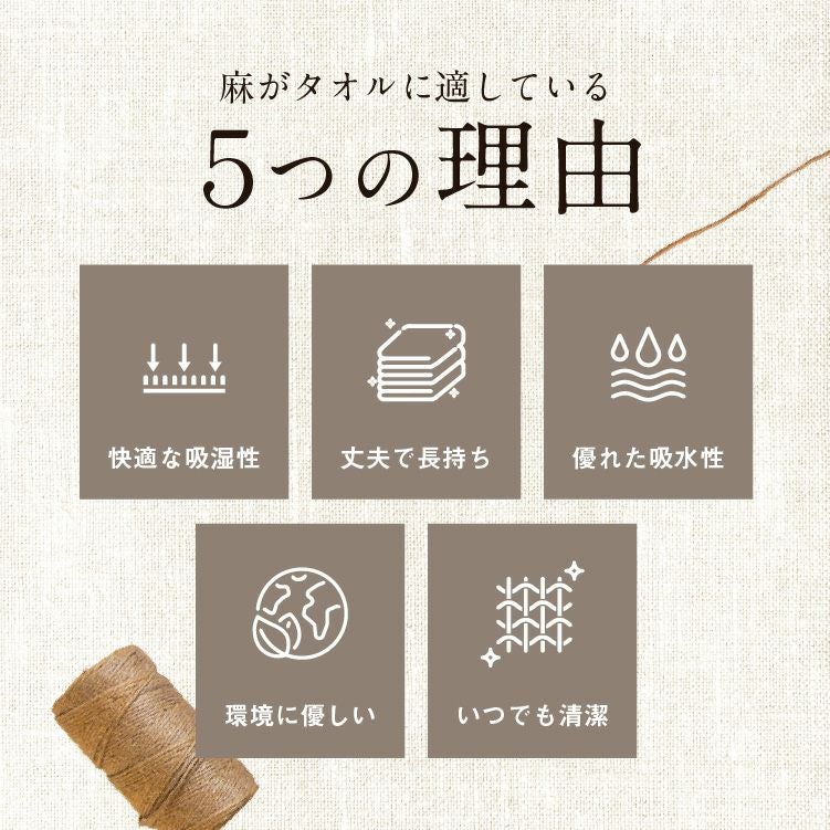 天然の機能性素材「麻」100%のバスタオルです。麻は吸水性や吸湿性に優れ、いつでも清潔ですぐに乾きます。「麻」は、古来より神仏や祝い事に使われいた神聖な素材、「麻」を贅沢に100%使用。一年草から作られる天然素材であるため、環境にやさしく、丈夫で長持ちで汚れにくい。「一生使えるタオル」としてご愛用いただけます。