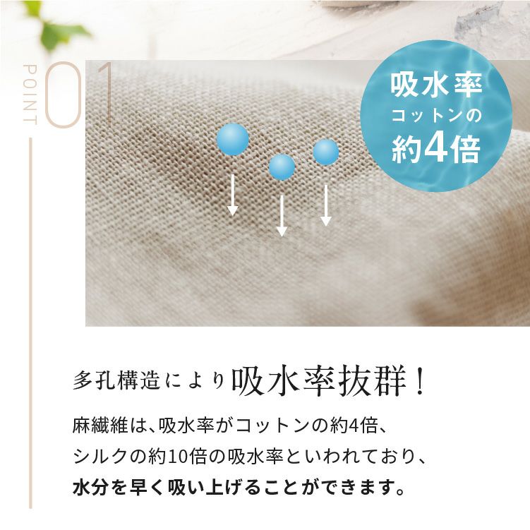 麻繊維は、吸水率がコットンの約4倍、シルクの約10倍の 吸水率といわれており、水分を早く吸い上げることができます。