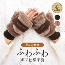 ふわふわボア仕様手袋 フード付き スマホ対応 レディース グローブ 指だし 2Way ミトン フィンガーレス