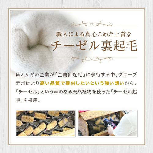 ほとんどの企業が「金属針起毛」に移行する中、グローブデポはより高い品質で提供したいという強い想いから、「チーゼル」という棘のある天然植物を使った「チーゼル起毛」を採用。