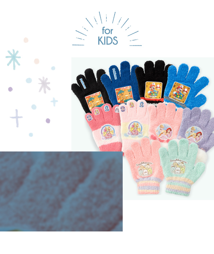 お子様が大好きな人気キャラクターが大集合♪カフス部分はニット2重構造で、冷たい外気が侵入しにくく、抜群の温かさ♪機能性も充実したキャラクター手袋です。キャラクターは「スーパーマリオ」「ポケットモンスター」「キミとアイドルプリキュア♪」「Disneyプリンセス」「すみっコぐらし」の5種類♪カラーバリエーションも含めると、10種類からお選びいただけます♪のびのび素材で高い伸縮性がございます。