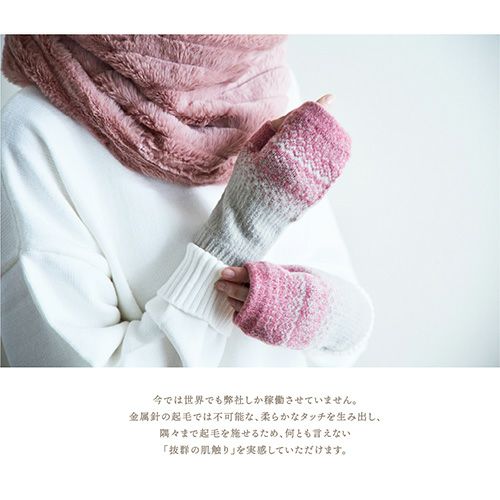 指無タイプのアームカバーで作業も楽にこなせます、プレミアシュー使用のカシミヤのような優しい肌触りの商品です。見た目のもこもこ感が少なく着用感もスリムに見えて手のラインがきれいに見えます。柄は人気のネコ柄など2柄。セルフヒーター加工でぽかぽか、室内でも外でもおすすめの商品です。