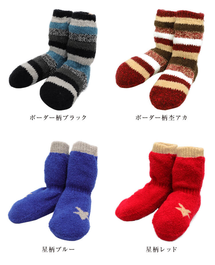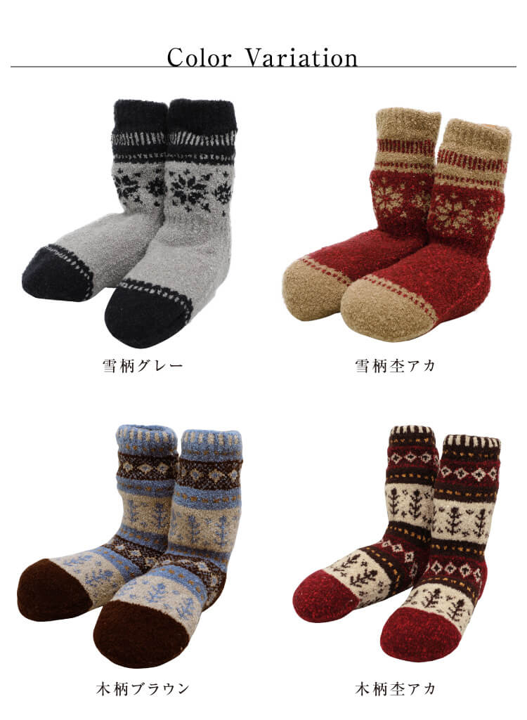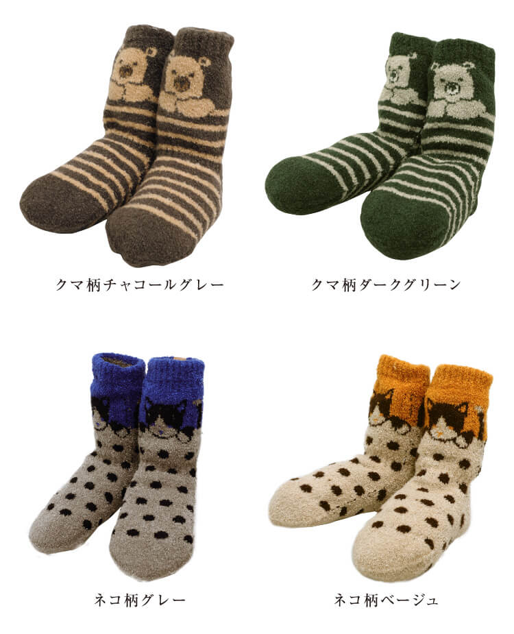 大好評のもこもこソックスにかわいくおしゃれなデザインソックスが新登場。全8柄の20パターンがお選びできます。落ち着いた雪柄やボーダー柄からかわいいクマ柄やネコ柄など足元をかわいく彩ります。もちろん他のソックス同様に足元をしっかりあたためられることは実証済、シュークリーム糸使用の立体構造で足元ぴったり。チーゼル裏起毛の上質なな肌触りは1度使うと病みつきです。さらにセルフヒーター加工でしっかりあたためてくれるので冷え性対策にもおすすめです。