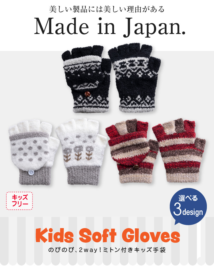 安心の日本製。デザインは指切りスタイルとミトンスタイルの2way機能搭載。3デザインで選べる豊富なバリエーションも魅力です。お子様もお気に入りの1点が見つかるはず。優れたストレッチ性を持つ素材を使用しているので装着しやすく、フィット感も抜群。締め付けず柔らかく包み込むようにお子様の手を寒さから守ります。ハーブ成分配合SelfHeater機能搭載なので、温感効果も期待でき、タッチパネル対応なのでさっと使いたい時にデザインを変えてスマホをご利用頂ける画期的な手袋です。