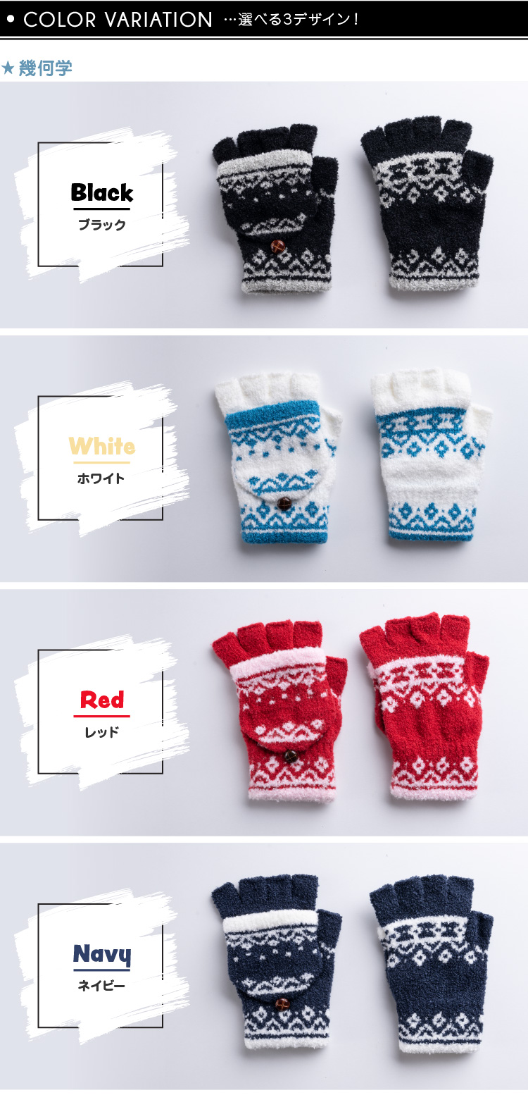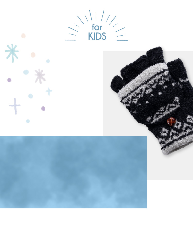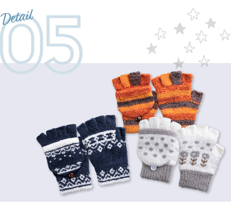 デザインは指切りスタイルとミトンスタイルの2way機能搭載。 3デザインで選べる豊富なバリエーションも魅力です。お子様もお気に入りの1点が見つかるはず。 優れたストレッチ性を持つ素材を使用しているので装着しやすく、フィット感も抜群。 締め付けず柔らかく包み込むようにお子様の手を寒さから守ります。 ハーブ成分配合のSelfHeater機能搭載なので、温感効果も期待でき、 タッチパネル対応なのでさっと使いたい時にデザインを変えて スマホをご利用頂ける画期的な手袋です。