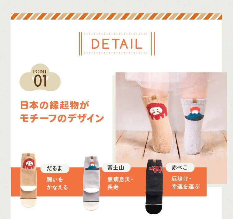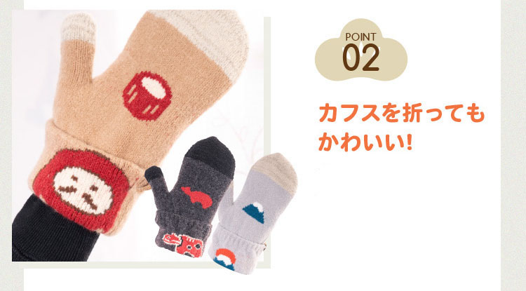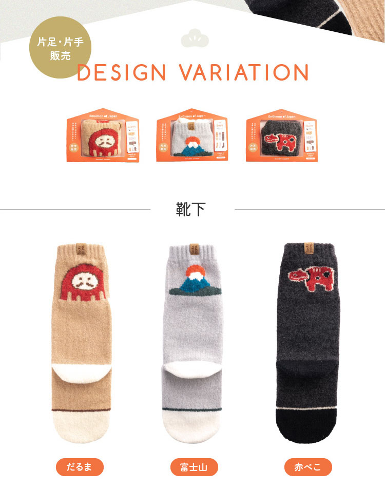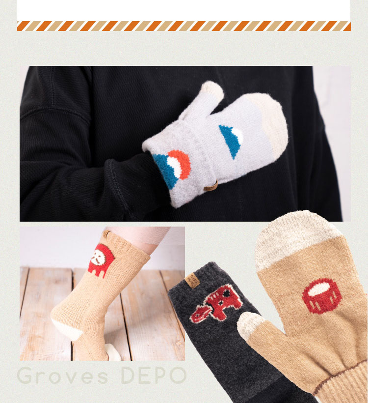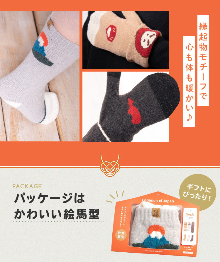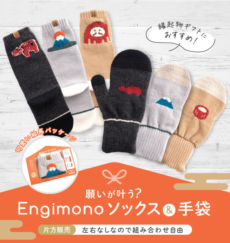 日本の縁起物をモチーフにデザインされたengimonoシリーズ。それぞれミトンと靴下をお届け。パッケージは絵馬モチーフでそのまま贈り物にしてもかわいい。海外の方へのお土産や受験生などにいかが?手袋はミトンタイプで指先でスマホの操作も可能。カフスを折り返せばそこにも縁起物が登場します。両方とも肌触りも柔らかくて気持ちいプレミアシュークリーム糸を使用。着用感もとても気持ちいい靴下&手袋です。片手・片足の販売となりますので左右で違うデザインをお楽しみいただけます。