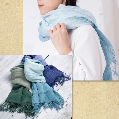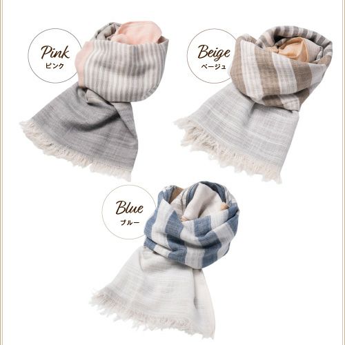 やわらかな綿素材と相性のいいブロックタイプとマルチボーダー、くすみカラーでいろいろなコーデに合わせやすい。リネンのグラデーション柄で巻いた部分で色が変わりきれいに着用可能。