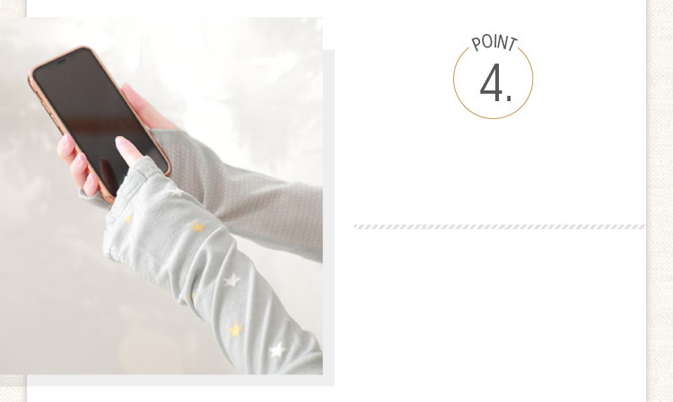 手のひら側はメッシュ構造で見た目にも涼しくムレにくく仕上げました。指なしタイプだから、スマートホン操作やパソコンなどのタイピングもラクラク♪普段着コーデにも合わせやすいカジュアルテイストから可愛く見せたいポップテイストまで選べる7柄。手元に取り入れるだけで、かわいいコーデでUV対策♪幅広い層の方にご使用頂けるかと思います。