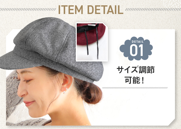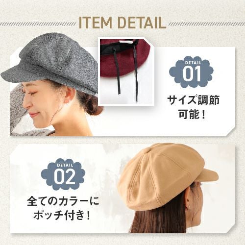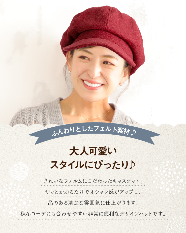 フエルト素材で大人可愛いスタイルにぴったりなレディースキャスケット。 きれいなフォルムにこだわったキャスケットで、品のある清楚な雰囲気に仕上がります。サッとかぶるだけでオシャレ感がアップするのも嬉しい。コーデにも合わせやすいので、これ1つもっていると非常に便利なデザインハットです。