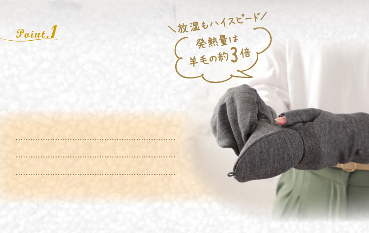 動物や鳥などが濡れた時に、体毛や羽毛が吸湿して発熱するメカニズムを応用したあったかアームカバー羊毛の約3倍の発熱量かつ、放湿も素早く行うので汗ばむこたなく快適。消臭効果にも優れ、静電気も置きにくいので冬のお供に最適です。表情豊かなかすり杢の生地が優しい風合いをコモ市出します。フード付タイプかカフス付きのアームカバーの2種類からお選びいただけます。