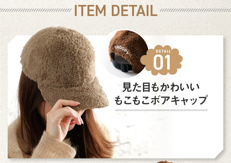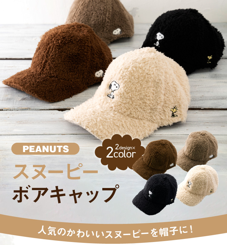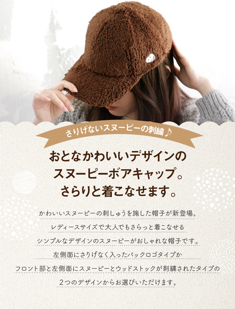 スヌーピーのかわいいボアキャップが新登場、ふわふわモコモコのボアキャップで秋冬にピッタリ。しっかりとしたつくりでタウンユースだけでなく散歩やアウトドアにもピッタリ。シンプルなデザインにさりげないスヌーピーのワンポイントの刺しゅう入りで大人でも使いやすいし、コーデにも合わせやすいキャップです。
