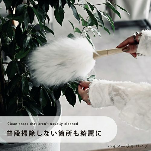 天然ウール100%のハンディ―ダスター。ウールは空気を閉じ込めて湿度を調整する繊維構造の為、ふわふわした弾力性がありホコリをよく絡めとる、ダスターには最適な素材です。摩擦もないからこんな風にお皿やカップの周りも大丈夫! パソコンのキーボードやテレビのリモコンなど小さな隙間はもちろん、驚くほど軽いので、天井の照明のランプシェードやクロスの高い部分のホコリ取りもラクラクです。 高級感ある革紐をフックに引っ掛けておけば、使いたい時にいつでもすぐにお掃除できます。すぐに手の届く場所に置いておく。インテリアにもスッと馴染んでくれますよ。