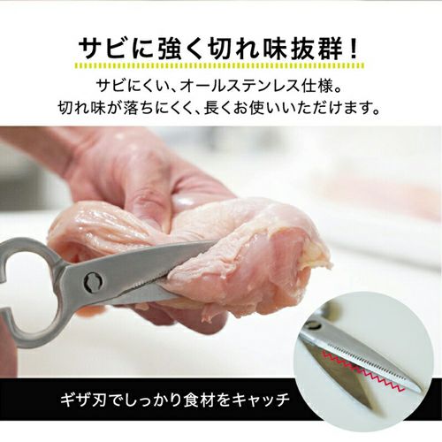 分解して丸洗い、食洗器での洗浄が可能なオールステンレスのキッチンバサミです。非常に軽く、長時間使用しても疲れません。洗いやすく、様々な用途に使えます。