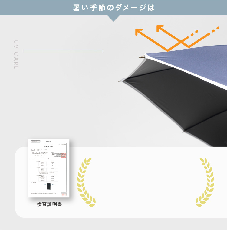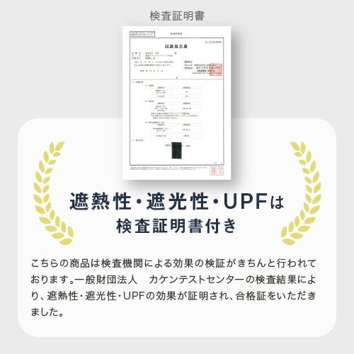 こちらの商品は検査機関による効果の検証がきちんと行われております。一般財団法人 カケンテストセンターの検査結果により、遮熱性・遮光性・UPFの効果が証明され、合格証をいただきました。