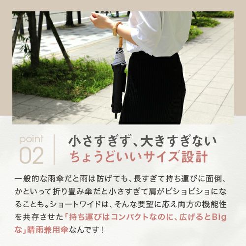 一般的な雨傘だと雨は防げても、長すぎて持ち運びに面倒、かといって折り畳み傘だと小さすぎて肩がビショビショになることも。ショートワイドは、そんな要望に応え両方の機能性を共存させた「持ち運びはコンパクトなのに、広げるとBigな」晴雨兼用傘なんです!
