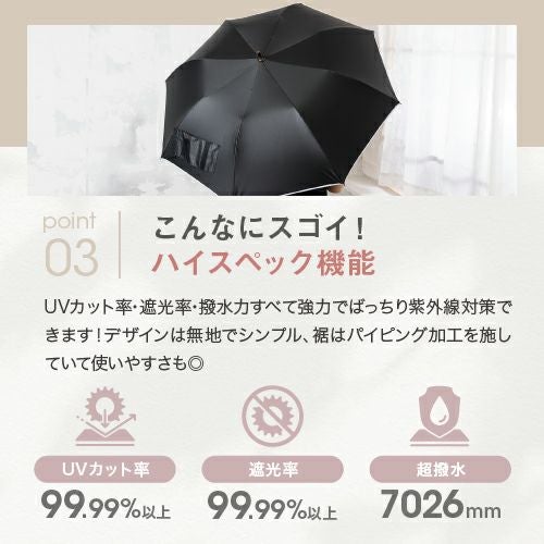 夏の紫外線対策・熱中症対策の必需品である晴雨兼用日傘。 UVカット率は99.9%!UPF50+で紫外線をしっかりカットしお肌を守ります。もちろん100%完全遮光で日差しの熱をカットするので熱中症予防にも最適!
