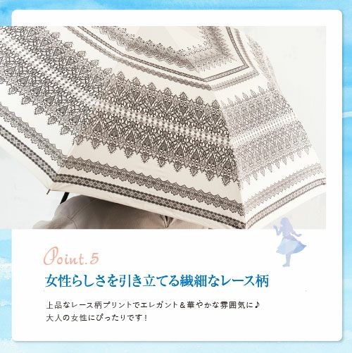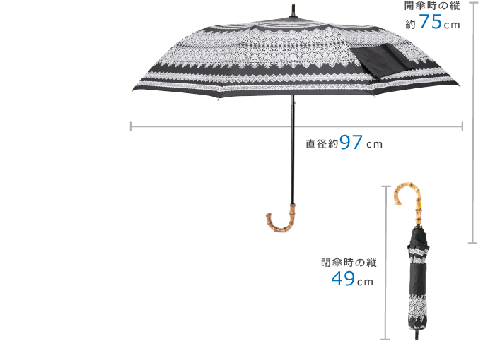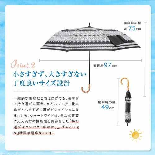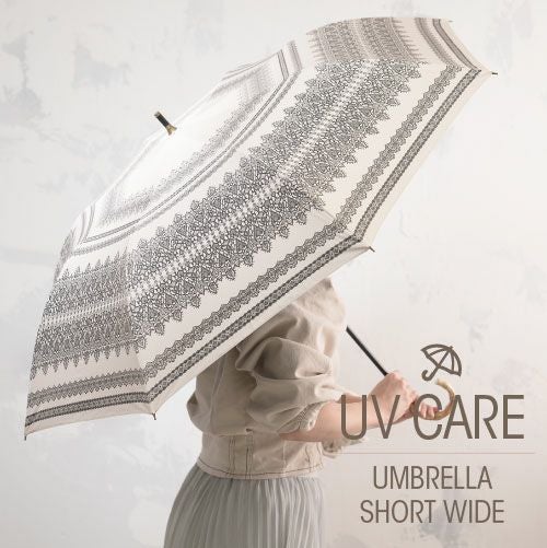 レース柄のプリントに竹の持ち手が上品なショートワイド傘が新登場!UVカット99.99%以上、遮光率99.99%以上、耐水度7026mmを誇る晴雨兼用のかわいいくて機能的、広い範囲で紫外線をカバーでき、おしゃれな日・雨傘。おしゃれにUVケア&急な雨の日にも使えるのがうれしいポイント。一般的な傘はかさばるけどこれなら大丈夫!ちょうどいい大きさになるよう設計されており、強い雨風に対抗する力も強く抜群の安定感と扱いやすさで大切なあなたの肌を守ります。バッグインだってOK!ありそうでなかった最愛傘です♪