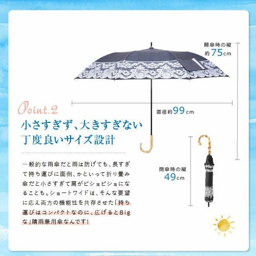 一般的な雨傘だと雨は防げても、長すぎて持ち運びに面倒、かといって折り畳み傘だと小さすぎて肩がビショビショになることも。ショートワイドは、そんな要望に応え両方の機能性を共存させた「持ち運びはコンパクトなのに、広げるとBigな」晴雨兼用傘なんです!