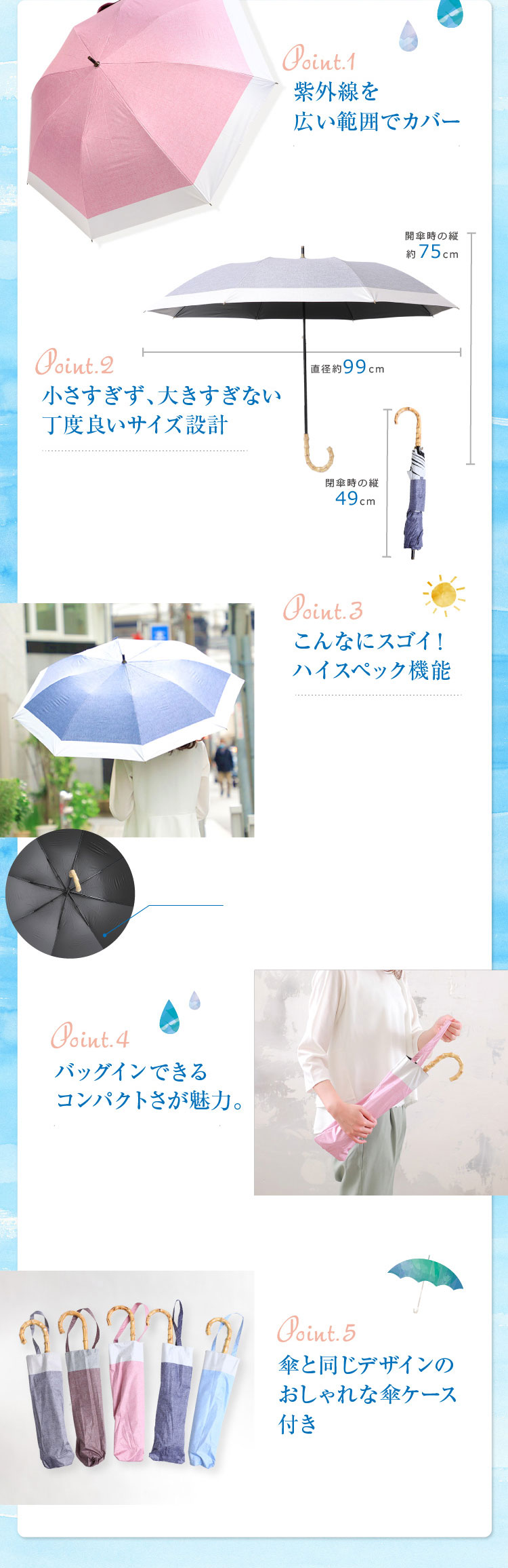 UVカット99.99%以上、遮光率99.99%以上、耐水度7026mmを誇る晴雨兼用のかわいいくて機能的、広い範囲で紫外線をカバーでき、おしゃれな日・雨傘。おしゃれにUVケア&雨の日にも使えるのがうれしいポイント。一般的な傘はかさばるけどこれなら大丈夫!ちょうどいい大きさになるよう設計されており、強い雨風に対抗する力も強く抜群の安定感と扱いやすさで大切なあなたの肌を守ります。バッグインだってOK!ありそうでなかった最愛傘です♪