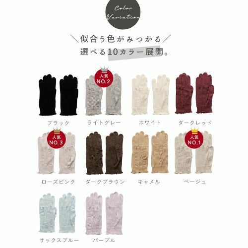 吸湿性・放湿性・保湿性に優れた「天然繊維シルク」。お肌に最も近い天然繊維と言われるほど人体への生体適合性が高く、刺激がないため、アレルギー体質の方にも安心してご使用いただける「シルク100%の手袋」です。しかも、日本製の糸を使い、日本で編み立てをしている素材から生産まで、安心の日本製レディース手袋、毛玉にもなりにくいシルク糸を使用。なんと言っても、一年を通して使えるのがシルクのスゴイところ♪夏は汗を吸収し、余分な水分を放出してくれるので、肌触りサラサラの快適な付け心地♪乾燥が気になり出す寒い冬には、インナー手袋として、モコモコ手袋の下に履くことで、ベタつきやムレもなく、素肌に直接履くより快適な肌触りをご実感いただけます。冬の夜にも手袋を着用したまま就寝してシルクが潤いを逃しません。お休み手袋としても乾燥にお悩みのレディースにおススメ。
