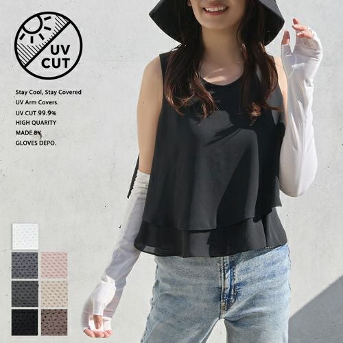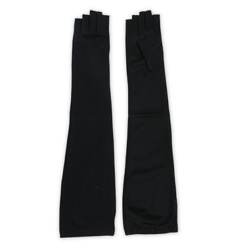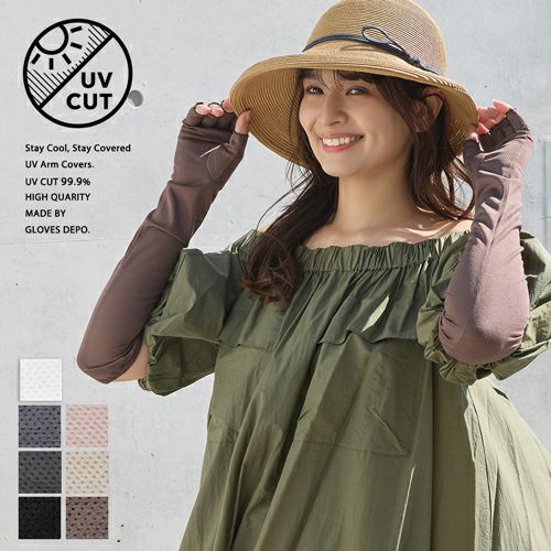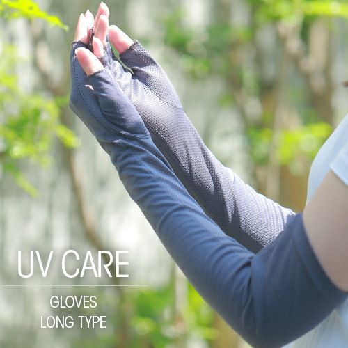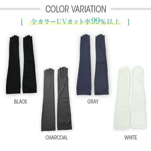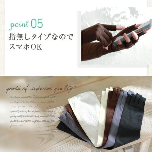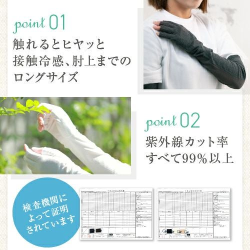 合格書付の接触冷感加工で触れるたびにヒヤッとした涼しい感覚があります。裏側はメッシュで見た目にも涼しくムレにくい仕様。メインの甲部は天然繊維綿50%と天然大豆繊維50%仕様により、お肌にやさしくなめらかな付け心地です。指の先は途中でカットされているデザインなので、装着したままスマホの操作が可能。どのカラーでも紫外線カット率99%以上、かつ少し長めのデザインなので、手首部分までしっかりガードします。