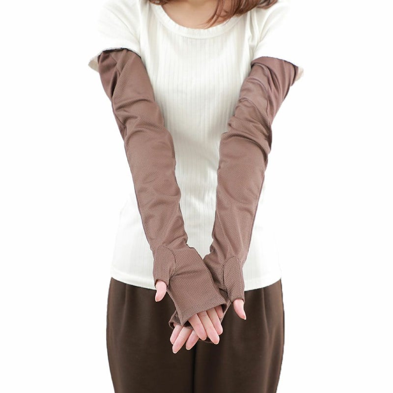 合格書付の接触冷感加工で触れるたびにヒヤッとした涼しい感覚があります。裏側はメッシュで見た目にも涼しくムレにくい仕様。メインの甲部は天然繊維綿50%と天然大豆繊維50%仕様により、お肌にやさしくなめらかな付け心地です。指の先は途中でカットされているデザインなので、装着したままスマホの操作が可能。肩口までの超ロングタイプデザインなので、ノースリー部着用時でもしっかりガードします。