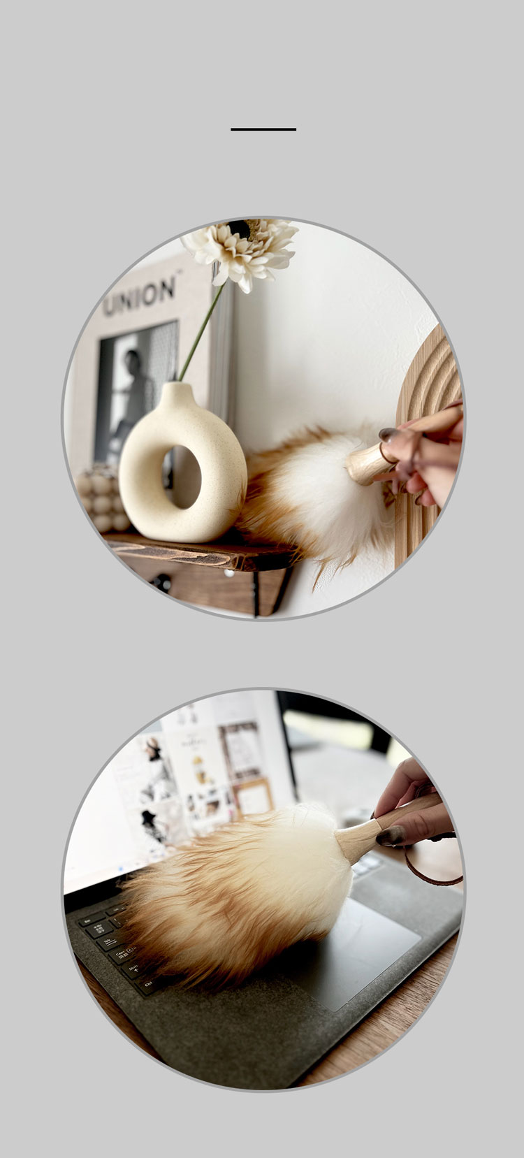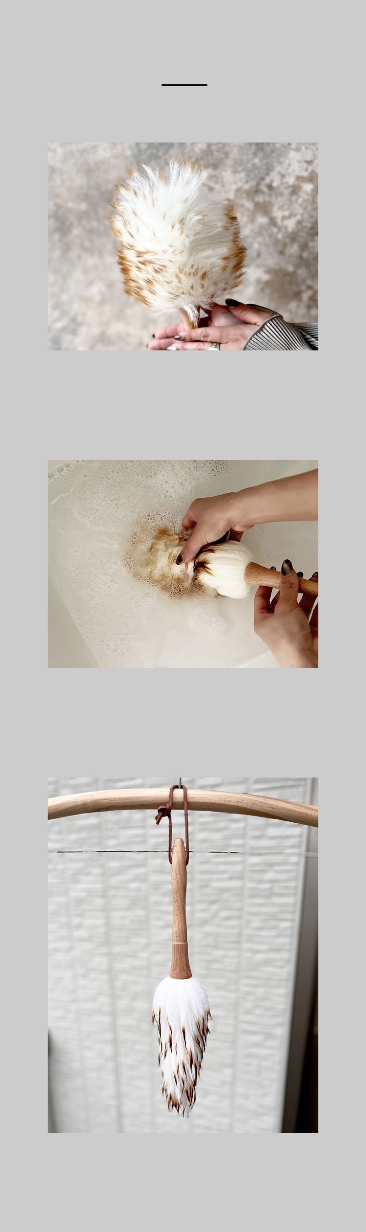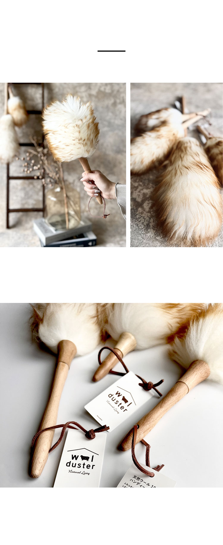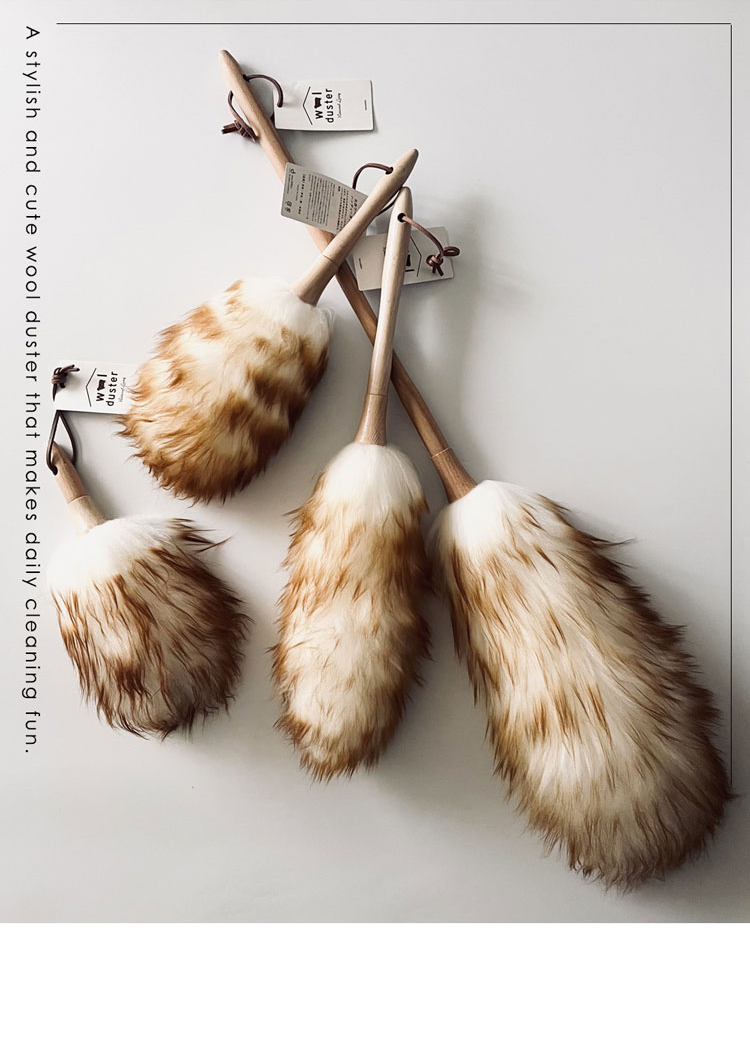 天然ウール100%のハンディ―ダスター。ウールは空気を閉じ込めて湿度を調整する繊維構造の為、ふわふわした弾力性がありホコリをよく絡めとる、ダスターには最適な素材です。摩擦もないからこんな風にお皿やカップの周りも大丈夫! パソコンのキーボードやテレビのリモコンなど小さな隙間はもちろん、驚くほど軽いので、天井の照明のランプシェードやクロスの高い部分のホコリ取りもラクラクです。 高級感ある革紐をフックに引っ掛けておけば、使いたい時にいつでもすぐにお掃除できます。すぐに手の届く場所に置いておく。インテリアにもスッと馴染んでくれますよ。