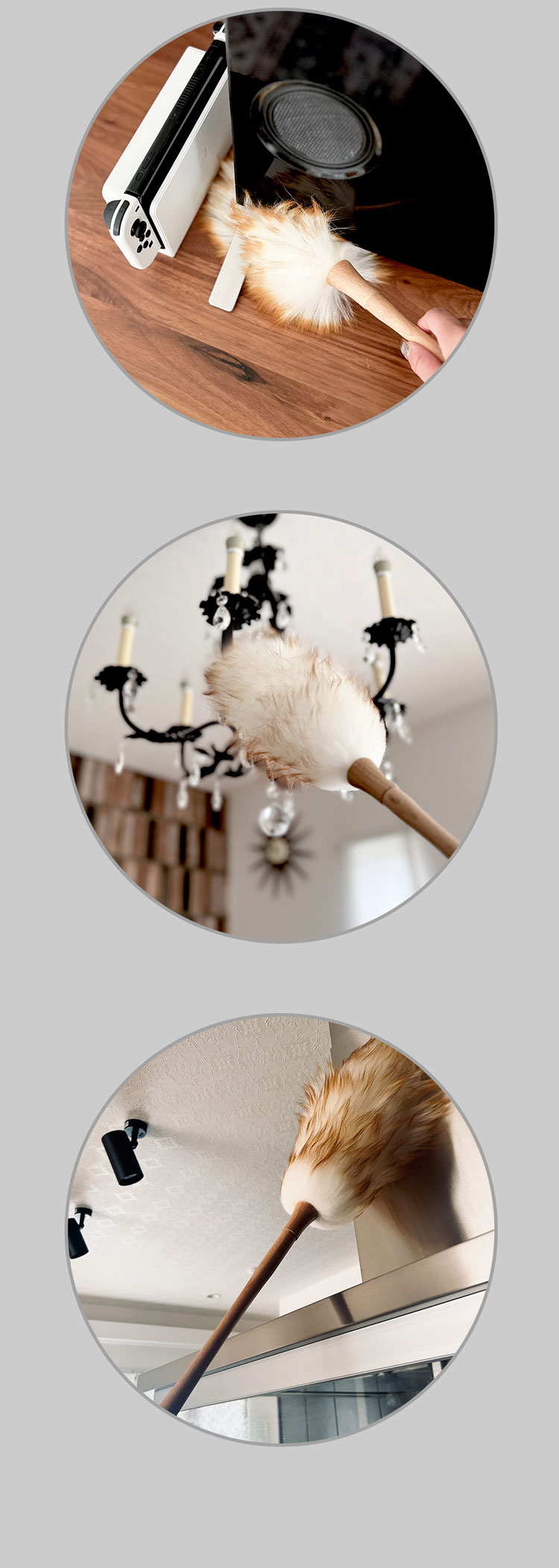 本体(柄)を両手で挟んでくるくる回せば、ホコリを軽く振り落とせます。※換気の良い場所で行ってください。