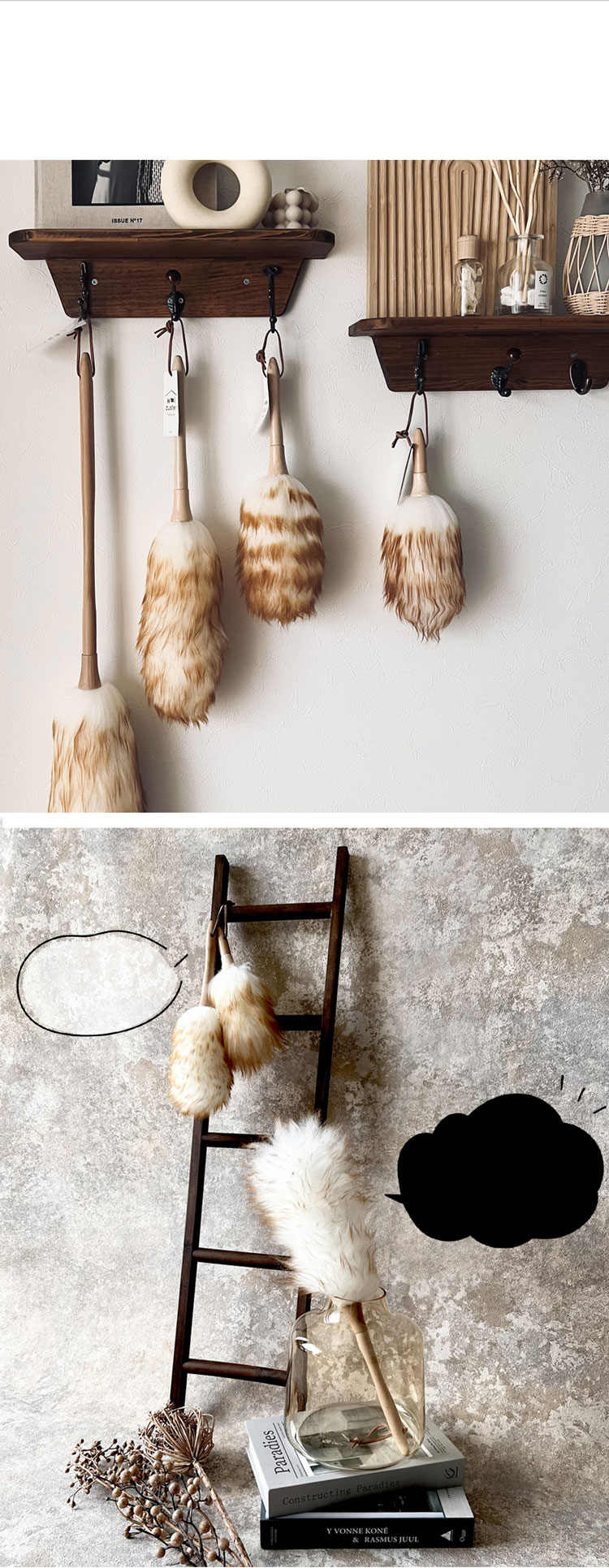 市販のプラスチックの無機質な商品より温かみがあります。埃もよく取れ、掃除機の掃除やPC周りなどが捗ります。 猫が届かない所に吊さないと大変な事になります。