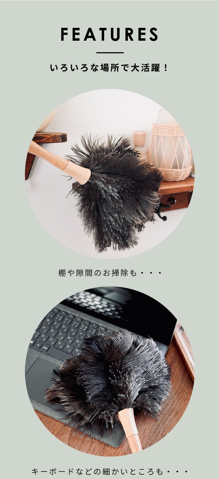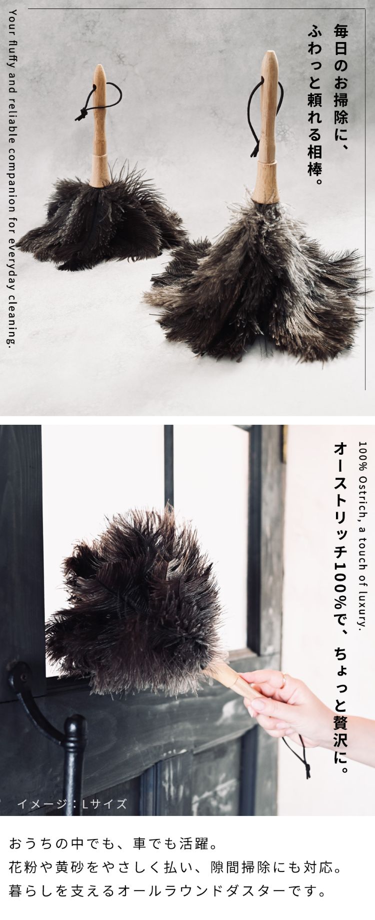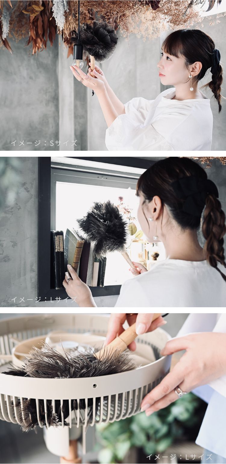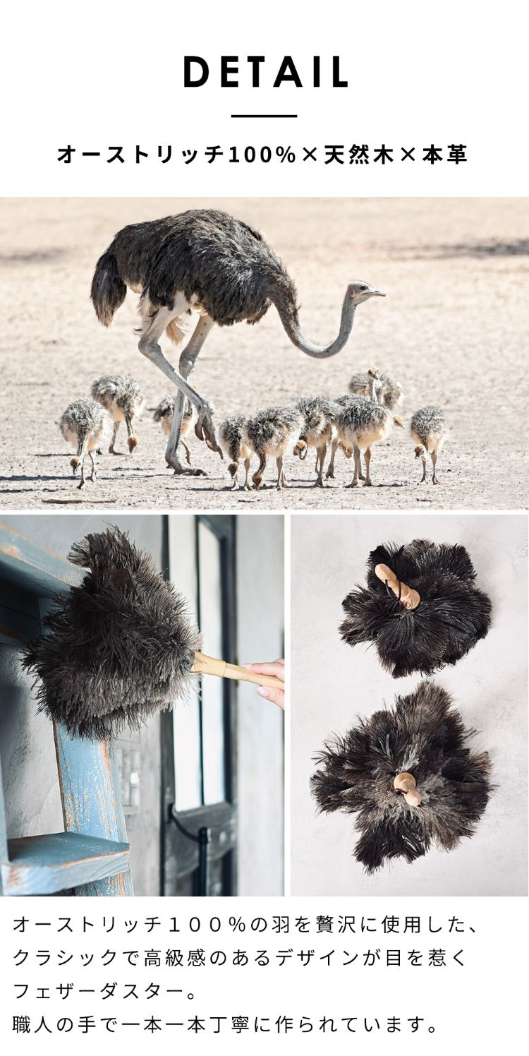 オーストリッチフェザーダスターは「静電気が起きにくい」「ホコリを舞い上げない」「デリケートな素材を傷つけない」 のが最大の特徴です。