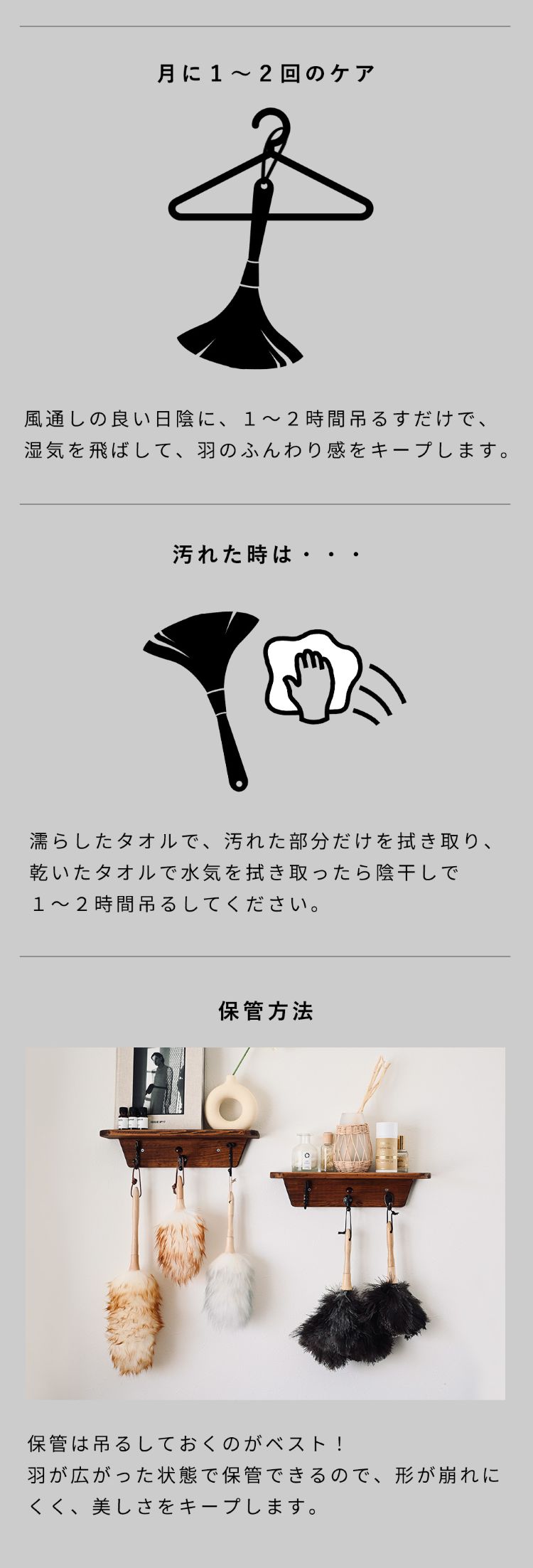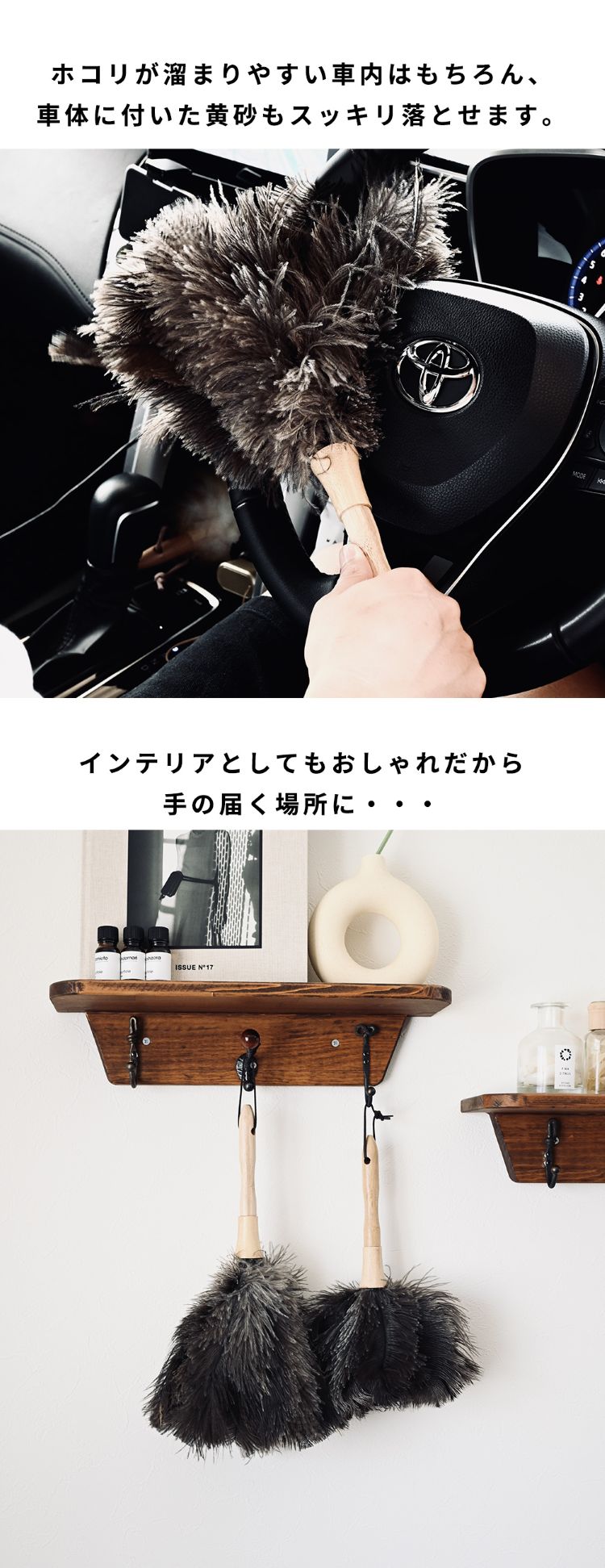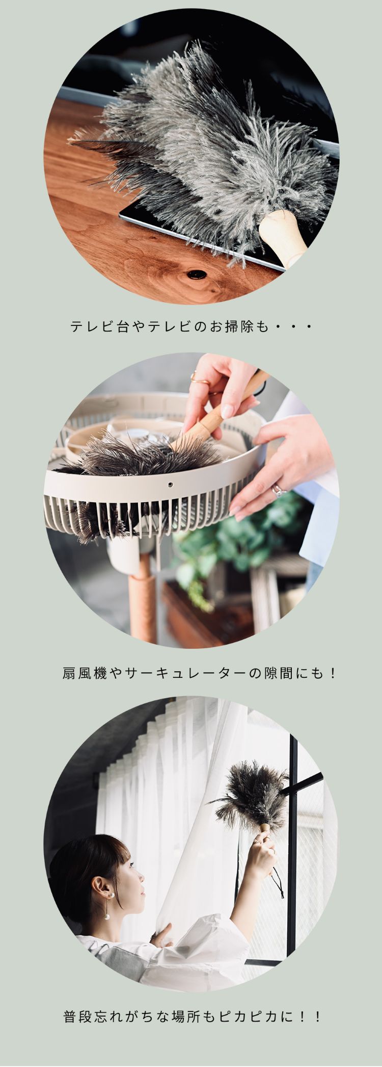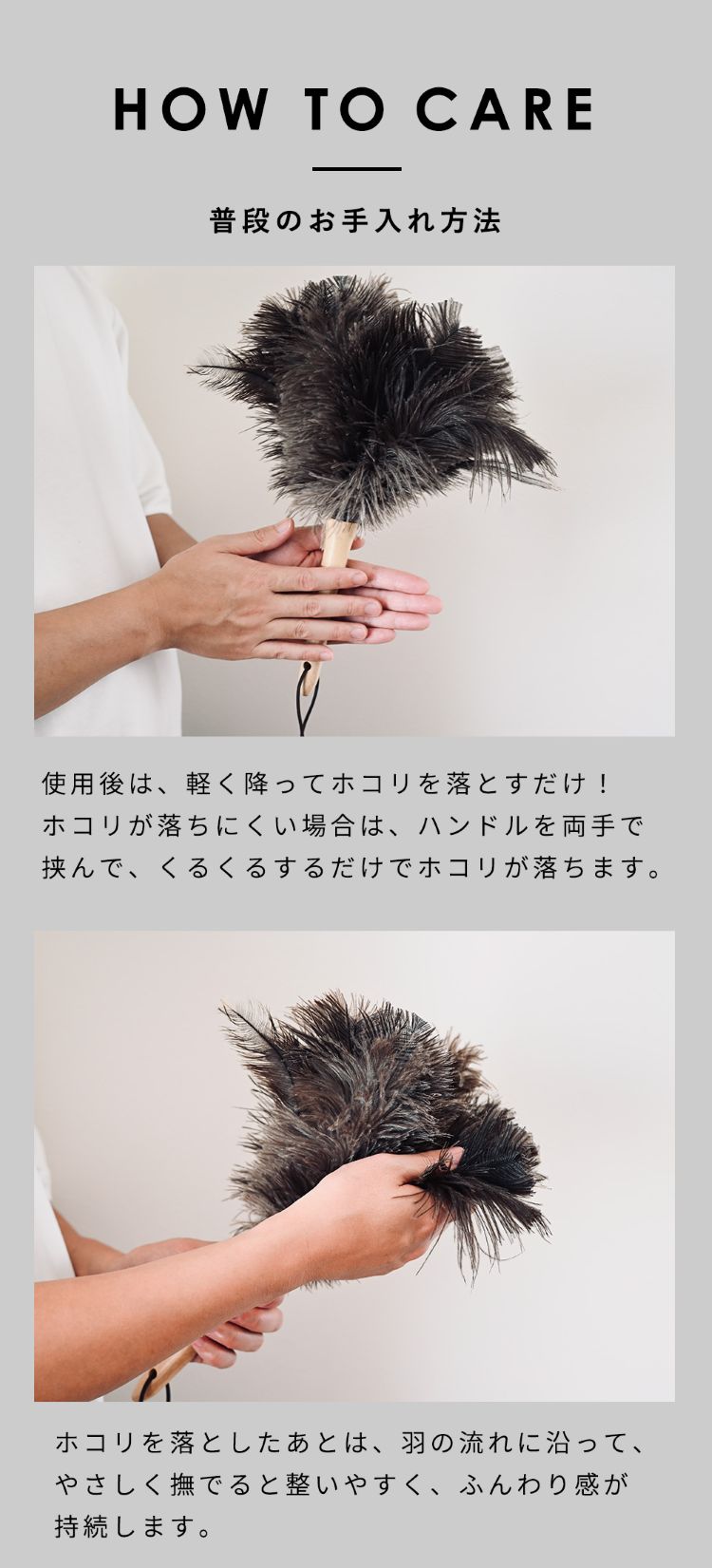 オーストリッチフェザーダスターは「静電気が起きにくい」「ホコリを舞い上げない」「デリケートな素材を傷つけない」 のが最大の特徴です。