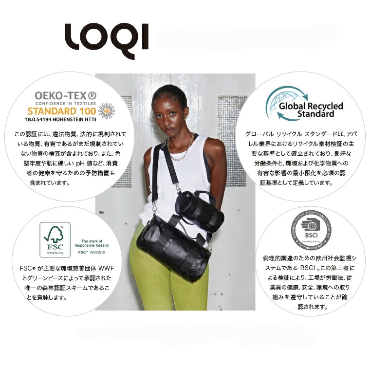LOQIは生地に有害物質を使用しないOEKO-TEXを取得しています。薄くて軽いバッグですが、耐荷重はなんと20kg!買い物やまとめ買いの際にも大活躍◎