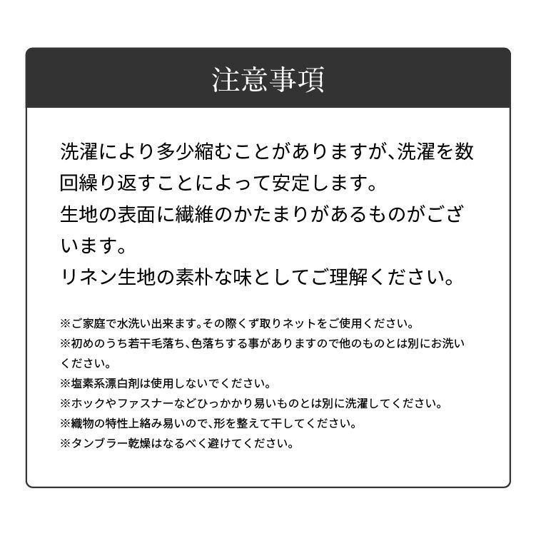 洗濯により多少縮むことがありますが、洗濯を数回繰り返すことによって 安定します。生地の表面に繊維のかたまりがあるものがございます。 リネン生地の素朴な味としてご理解ください。