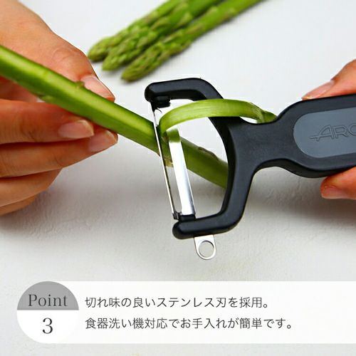 毎日使うキッチンツールなので、使いやすさと切れ味、安全性を重視してデザインされたプレインな刃の皮むきです。できるだけジャガイモの表層部の皮を薄く剥くことで、ビタミンCが残るように意識して刃の角度を設計されています。
