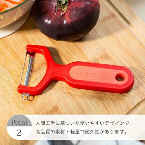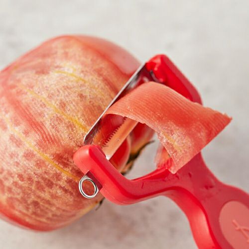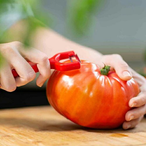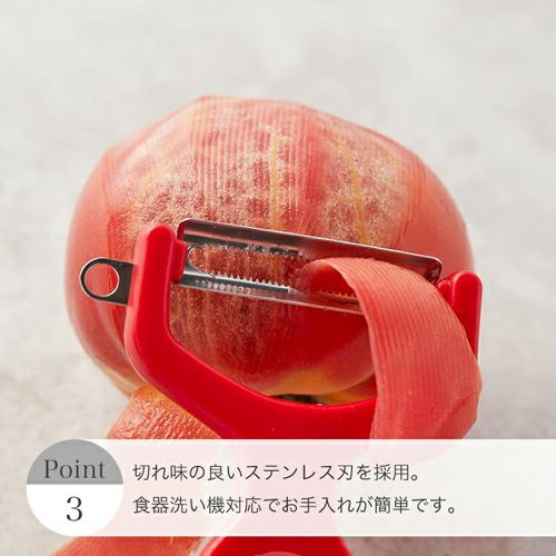 薄皮の野菜や、皮の硬いフルーツを綺麗に剥けるギザギザ刃のピーラーです。生でトマトを食べるときも、皮を剥いてオリーブオイルが染み込みやすくしたり、また加熱調理ではスープや調味料がトマトと飽和しやすいように簡単に下ごしらえができます。