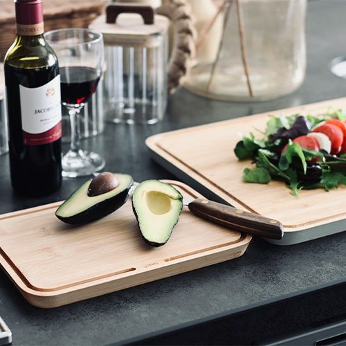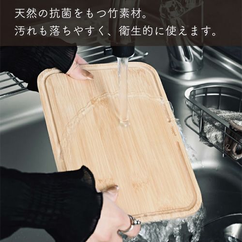 竹製カッティングボードは、適度な硬さがあり、刃当たりがとてもスムーズ。食材を切りやすく、包丁との相性も良い素材です。端に溝があるので、 余計な水をキャッチし、調理台を汚しません。