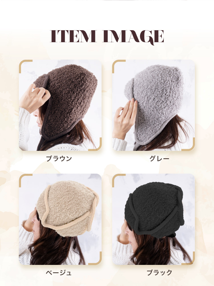 くしゅっとしたモコモコ感に耳付きデザインが魅力。耳当てを上げたりたらしたりと、気分やコーデに合わせたアレンジも楽しめます。