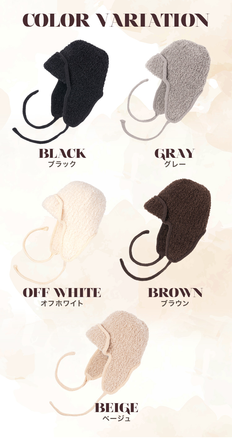くしゅモコ感が可愛い耳付きニット帽、耳当てを上げたりたらしたりでのアレンジも可能。ストレッチ性もあるのでかぶる際にもぴったりフィット。非常にやわらかな素材で肌触りも心地よい。秋冬の街歩きにもピッタリのフライトワッチです。全5色からお選びいただけます。