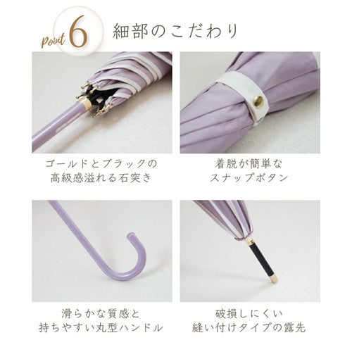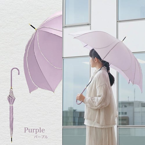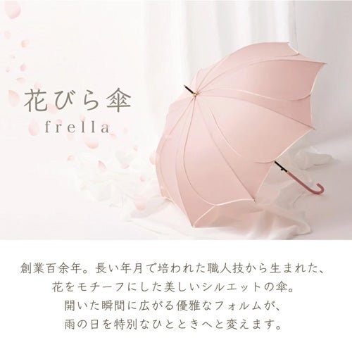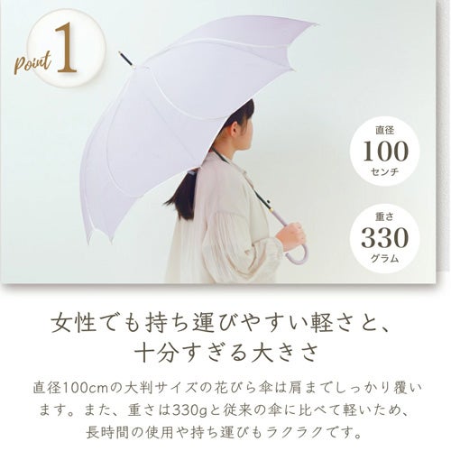 長い年月で培われた職人技から生まれた花をモチーフにした美しいシルエットの傘。開いた瞬間に広がる優雅なフォルムが、雨の日を特別なひとときへと変えます。直径100cmの大判サイズの花びら傘は肩までしっかり覆います。また、重さは330gと従来の傘に比べて軽いため、長時間の使用や持ち運びもラクラクです。