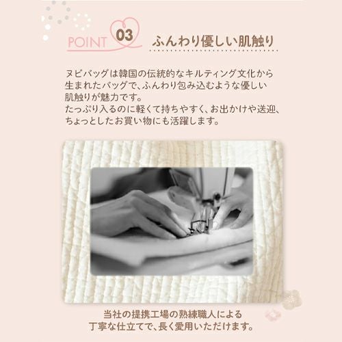 ヌビバッグは韓国の伝統的なキルティング文化から生まれたバッグで、ふんわり包み込むような優しい肌触りが魅力です。たっぷり入るのに軽くて持ちやすく、お出かけや送迎、ちょっとしたお買い物にも活躍します。