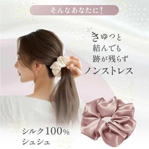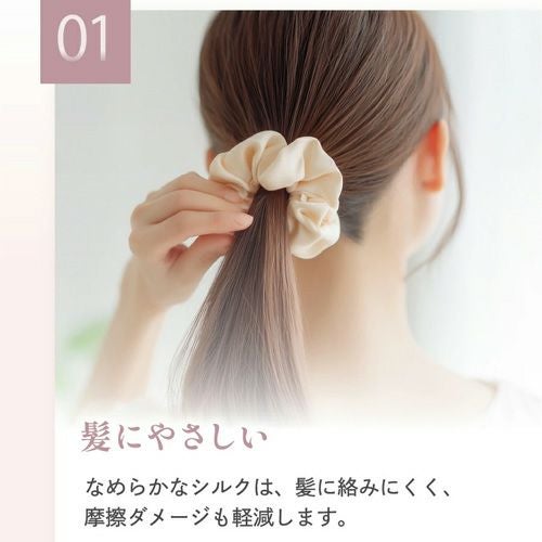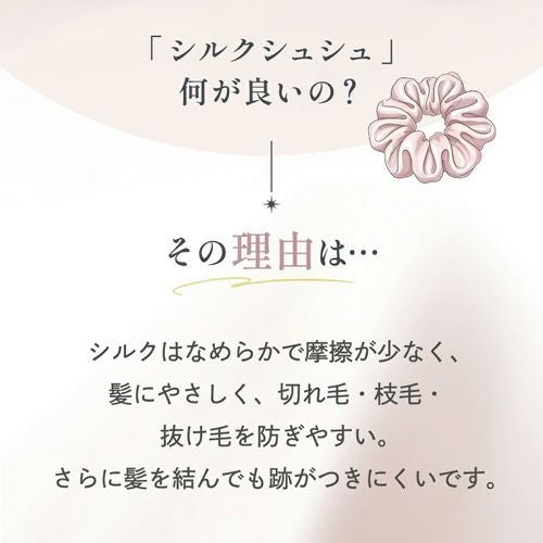 摩擦が少なく、結んだときの髪への負担を抑え、ツヤ感のあるまとまりをキープします。一般的なシュシュに比べて、跡がつきにくく、長時間つけてもストレスフリー。デイリー使いはもちろん、就寝時やリラックスタイムにもおすすめです。上品な光沢とシンプルなデザインで、カジュアルにもきれいめにも相性抜群。カラー展開も豊富なので、コーディネートや気分に合わせてお選びいただけます。髪を結ぶ時間を、少し贅沢に。毎日使いたくなる、大人のためのシルクシュシュです。