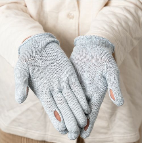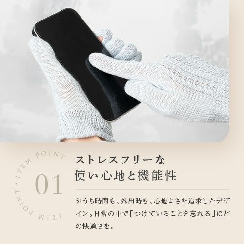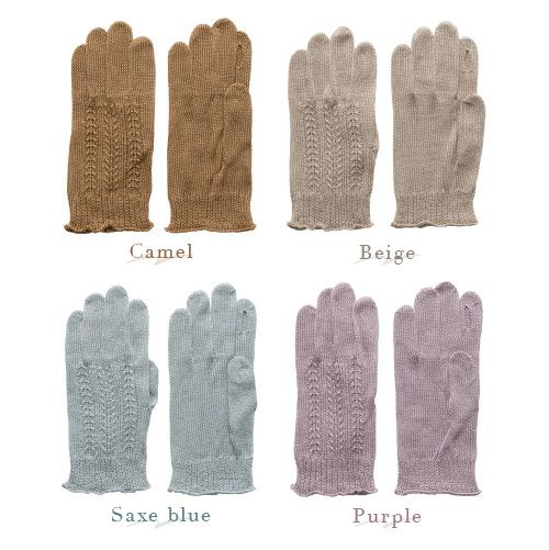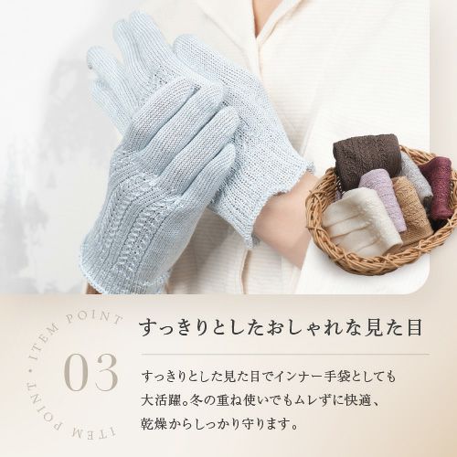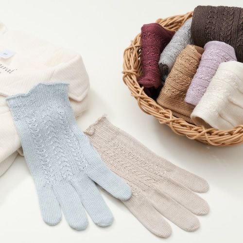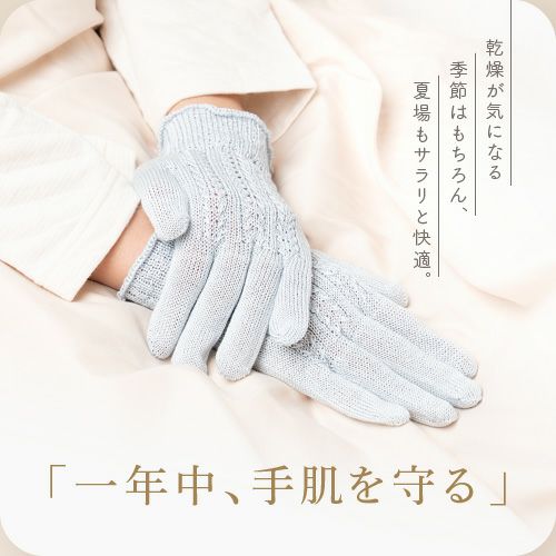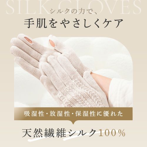 吸湿性・放湿性・保湿性に優れた「天然繊維シルク」。お肌に最も近い天然繊維と言われるほど人体への生体適合性が高く、刺激がないため、アレルギー体質の方にも安心してご使用いただける「シルク100%の手袋」です。しかも、日本製の糸を使い、日本で編み立てをしている素材から生産まで、安心の日本製レディース手袋、毛玉にもなりにくいシルク糸を使用。なんと言っても、一年を通して使えるのがシルクのスゴイところ♪夏は汗を吸収し、余分な水分を放出してくれるので、肌触りサラサラの快適な付け心地♪乾燥が気になり出す寒い冬には、インナー手袋として、モコモコ手袋の下に履くことで、ベタつきやムレもなく、素肌に直接履くより快適な肌触りをご実感いただけます。冬の夜にも手袋を着用したまま就寝してシルクが潤いを逃しません。お休み手袋としても乾燥にお悩みのレディースにおススメ。